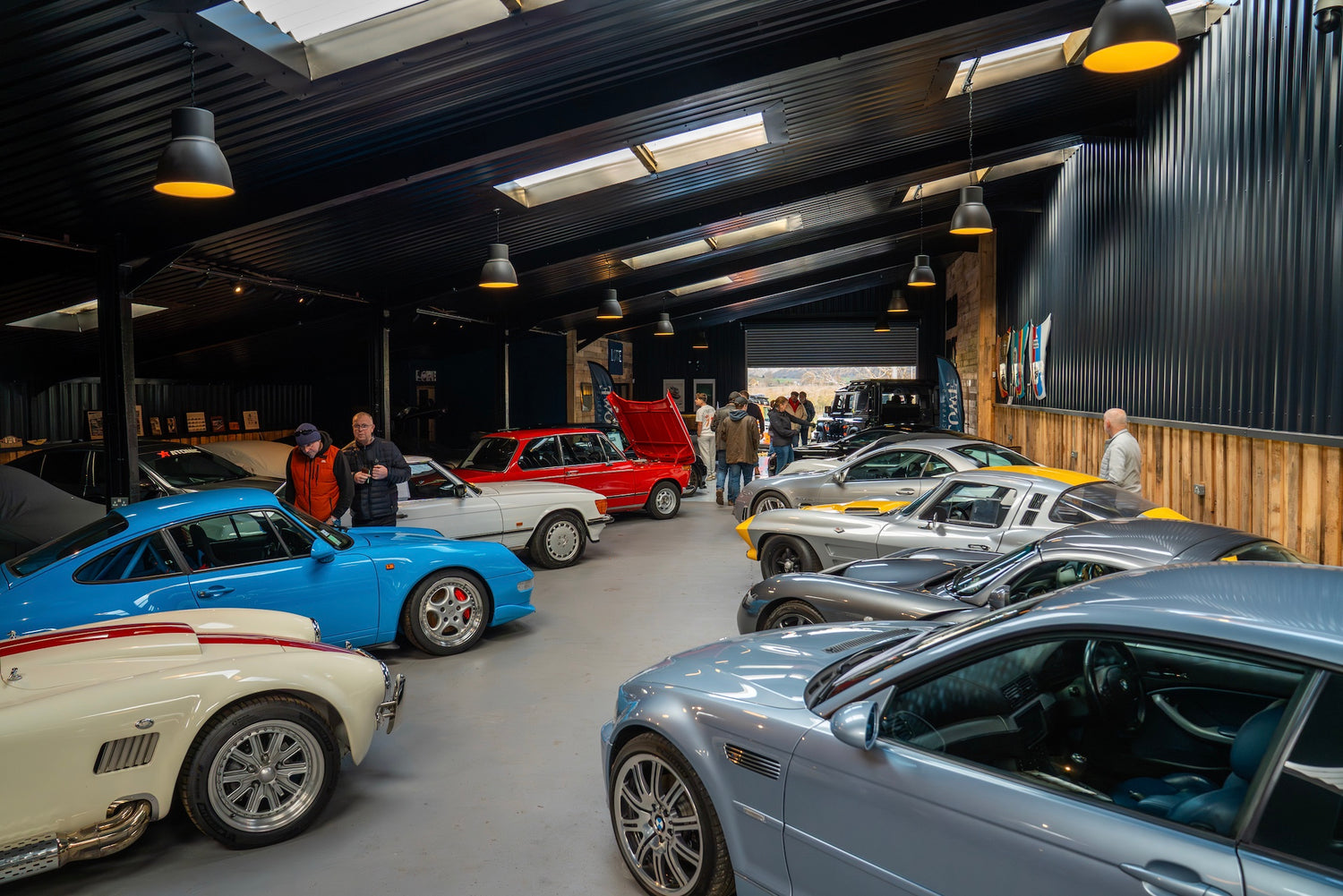 A curated collection of classic and modern vehicles, displayed next door to the workshop.